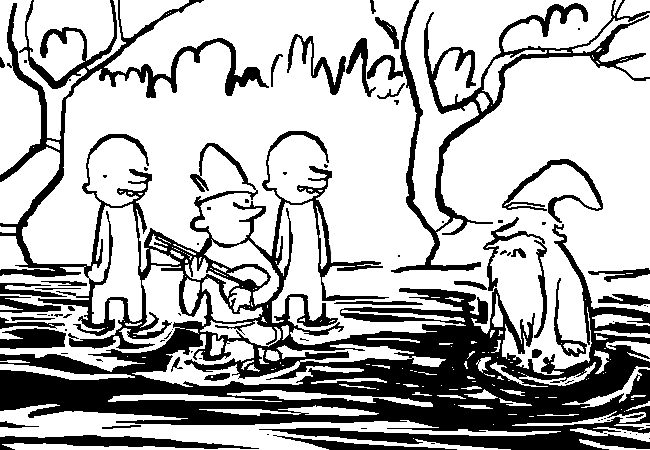 You find yourself in a really moist and smelly swamp. This is where the investment of a stolen cod piece really pays off. Your groin is warm and dry.