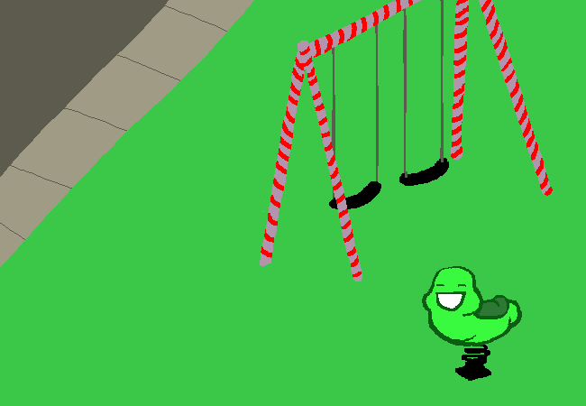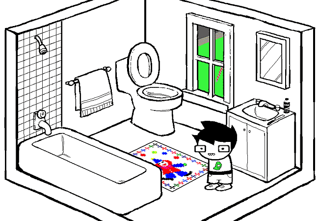 You enter the BATHROOM. You can see your BACK YARD from the window. The jewel in its crown is the SWING SET which has provided you with years of joy. There is also a SPRING-MOUNTED POGO-RIDE, which has been responsible for more than one painful injury, and has provided you with years of lament.