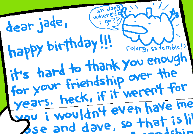 i went to a weird asian store the other day and saw this rad shirt, so i got it and i'm wearing it now! but there was a blue one too which was way more awesome, and i wanted you to have it. i know you like green a lot, but maybe you'd like to try wearing blue sometimes? i bet you'd look like a million bucks! also i know you've been frustrated lately about how your pumpkins keep disappearing. well, i can't begin to explain why that's happening! all i can do is give you these so you can plant some more. don't give up, jade! wherever those dumb old pumpkins went off to, i'm sure you know the fun is in growing them and taking care of them until they're ready!