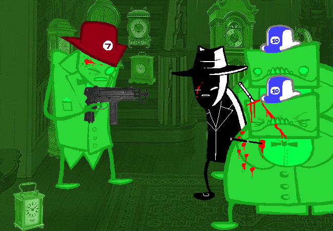 It seems Sawbuck from this timeline (i.e. the "real" Sawbuck) was in this room at this point in time. He and Crowbar exchange bullets. Off they go.