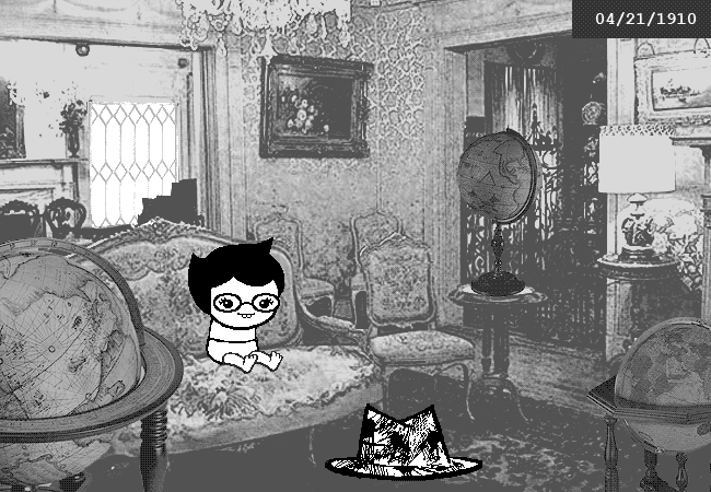There is a large monitor. Displayed on it is a small human girl in a fancy house. The date is April 21, 1910.