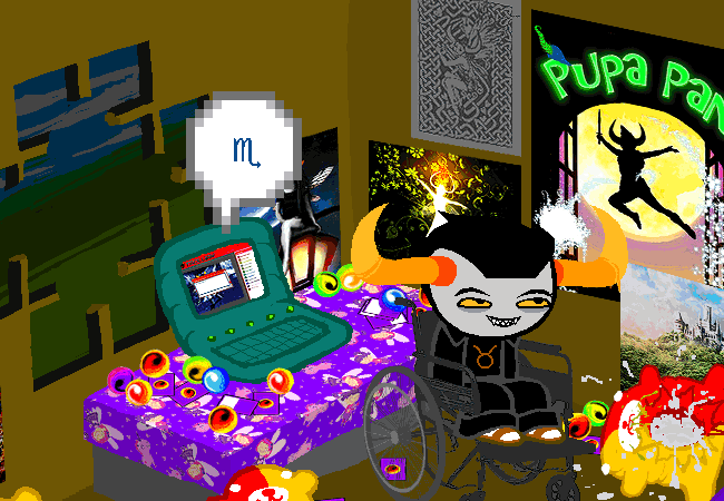 You wheel over to your favorite poster featuring PUPA PAN, which is your favorite thing. You have always fantasized that one day intrepid young Pupa would come and take you away, and together you would fly to a beautiful paradise planet of legend, that has all sorts of fanciful stuff like pirates, treasure, a cruel villain with a missing arm and a missing eye, and these weird aliens called "indians". You have left your window open since you were very young, just in case Pupa stopped by one night and decided to splash a pinch of SPECIAL STARDUST in your face.