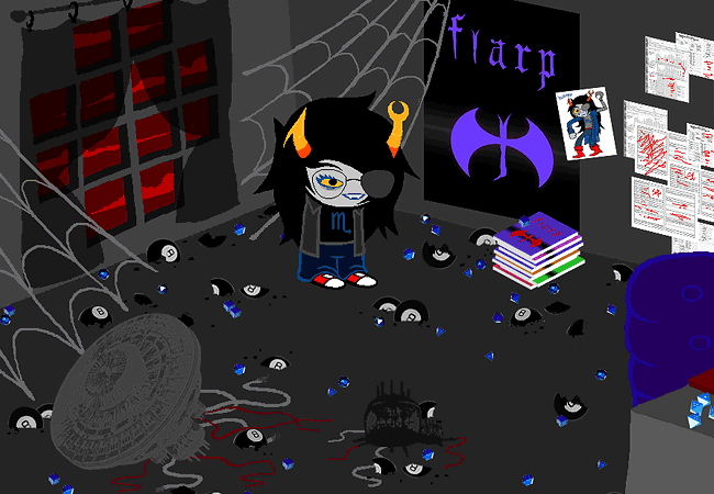 Your lusus is VERY HUNGRY, ALL THE TIME. She can only be appeased by the FLESH OF YOUNG TROLLS. You cloud campaigns for teams of Flarpers, utilizing your abilities for ORCHESTRATING THE DEMISE OF THE IMPRESSSSSSSSIONA8LE. Your victories supply you with treasure, experience points, and SPIDER FOOD.