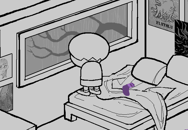 Your panoramic window offers a view of your yard below, and the mausoleum housing your dead cat, JASPERS, who died when you were young. Your MOM had the structure erected with a spirit of scornful IRONY in response to your youthfully innocent request to hold a funeral for the animal. At least, that is how you have come to interpret the gesture in retrospect.