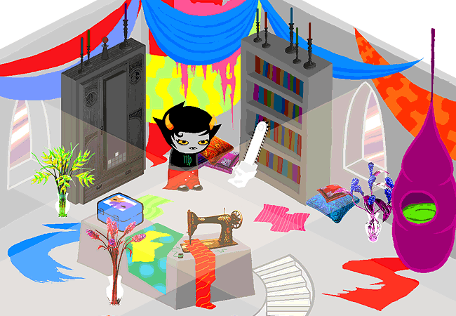 You are one of the few of your kind whose affection for the aesthetic strongly overpowers instinctive regard for the utilitarian. As such, you are one of the few of your kind who has developed a zeal for FASHION and DESIGN and LIVELY COLORFUL PATTERNS. You decorate your hive with FLORA and FABRIC, as delicately or aggressively as inspiration demands. You are a SEAMSTRESS or a RAGRIPPER or a TREETRIMMER or a LUMBERJACK, whichever you care to be, and your unique hive is equipped with a great supply of advanced technology to accommodate your interests. The technology and indeed the hive itself were all recovered from the ruins nearby when you were very young. The seed of your hive was deployed on the volcanic rocks beneath the sand with the assistance of your lusus and her remarkable burrowing skills, and you have lived there happily together since.