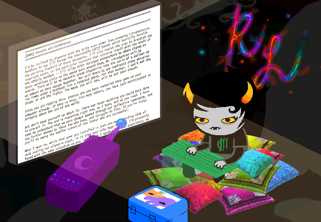 You can only assume this took place a long time ago. This race is likely ancient, preceding yours by millions of sweeps. Maybe billions! You like to try to imagine the adventures of these players. Were they successful in repopulating their race? Did they manage to protect their matriorb and hatch a new mother grub? Could they hold it together, or were they torn apart by the complex social dynamics, the matespritships and moirallegiences and auspisticisms and kismesissitudes that will surely plague your group along the way?