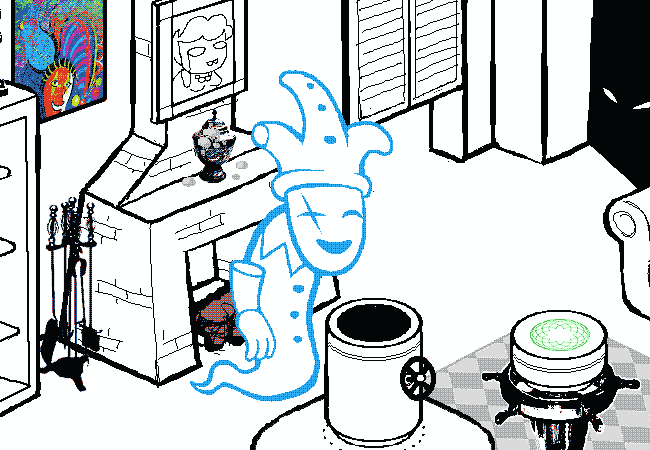 In the other room, NANNA'S ASHES dump onto the SPRITE, which is caught unawares by the dousing.