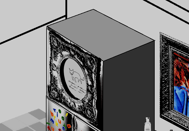 This was a drawing you did of your cat JASPERS when you were younger, along with a poem about him. Your mother bought this ostentatious $15,000 frame for it, and had it welded to the door.
