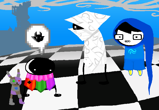 You and your rabbit friend approach a gentleman wrapped in a fine white cloth, and his courageous cohort, a young man riding a great gust of wind!