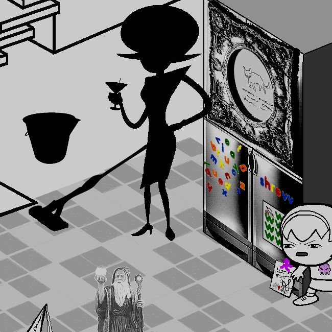 And of all things to be doing during a power outage. She's up to her IRONIC HOUSEWIFE routine again. That mop bucket doesn't even have any water in it! What an absolute madwoman.