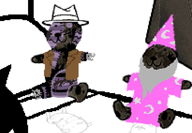 These customized bunnies were gifts to you on your 13th birthday, from two of your friends. Both were heirlooms passed down to them, and they decided to coordinate gift ideas and send you dressed up versions of their beloved childhood toys. You like to think he was shooting for a detective bunny with the one on the left, but you know realistically it was probably an Indiana Jones bunny more in line with his interests than yours, especially since it came with a little whip you have since misplaced. The bunny used to belong to his GRANDMA. The other one used to belong to your friend's MOM, and she dressed it as a wizard, which was also unapologetically more representative of her interests than yours. That's ok though, you loved the gesture anyway, and you and she are totally BFFSIES 4EVERZ, her words. And you agree with them!