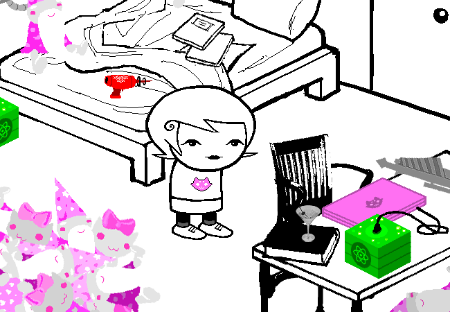 One of the last two stands in her bedroom. It is a young lady! Due to an incident involving an APPEARIFIER, an unabridged COLONEL SASSACRE'S, and a PERFECTLY WHITE CAT, she will not be able to assist her bffsy for some time. And due to the aggressive aconcurrence of all that takes place in paradox space, this incident HAS NOT HAPPENED YET.