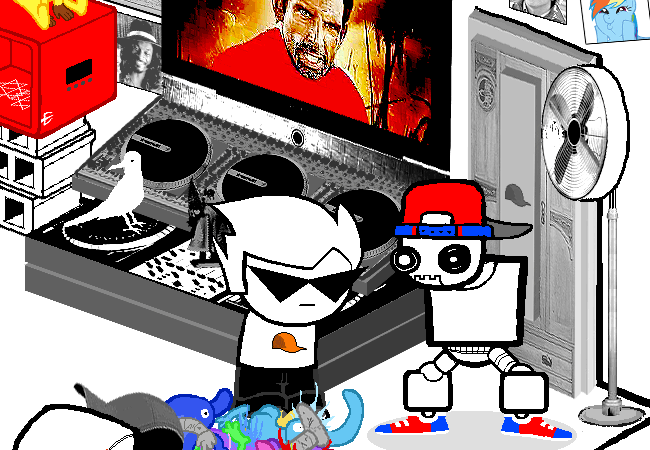 His name is SQUAREWAVE. You built him to have rap-offs with now and then. He's an enthusiastic rapper, and gives it his all whenever you duel, but he's pretty easy to destroy. You've never lost a match against him.