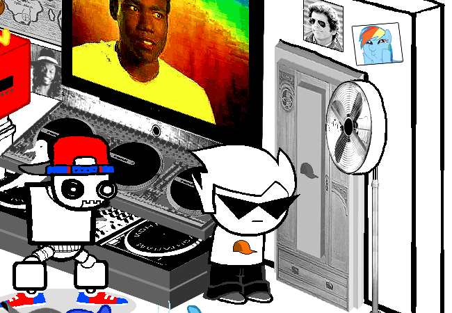 You tell Squarewave to scoot out of the way so you can get a load of your sweet fashions. Aw, looks like he really wanted to rap with you! Sorry guy, maybe another time.