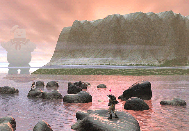 JOHN: follow me so we can seize the high ground against this hideous ocean dwelling marshmallow man, and steal all of his treasure.