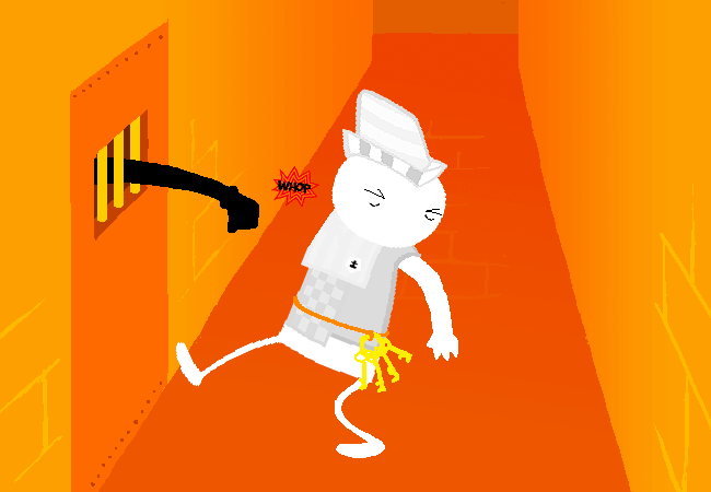 Your clumsy fist accidentally flies through the bars, knocking out a passer-by. Keys from his key ring jangle on the floor.