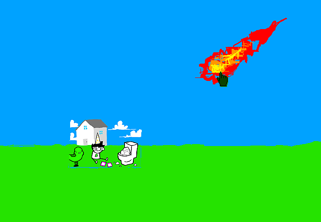 A METEOR APPEARS WITHOUT EXPLANATION. IT IS HEADED DIRECTLY FOR THE MALE. THERE IS NOTHING HE CAN DO BUT ACCEPT HIS FATE. LOOK. HE DOES NOT EVEN TRY TO FLEE, BECAUSE HE IS AN IGNORAMUS.