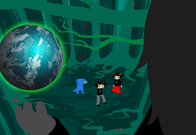 KARKAT: BUT MAYBE IF IT'S NOT *TOO* MUCH EXTRA TROUBLE, YOU COULD HELP ME UNDERSTAND WHY YOU'VE STRANDED US ON A BUNCH OF DIFFERENT PLANETS, ONLY TO COME TAUNT ME WITH A WATERLOGGED, MINIATURIZED VERSION OF EARTH???