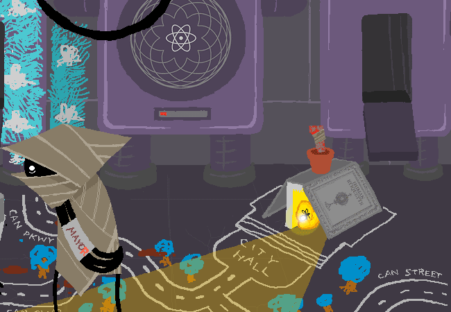 You temporarily dismantle CITY HALL to free up all the canpower available to create a vigilant TOWN MILITIA. You divide them into two groups, marking them with distinct teams and ranks using the piece of white CHALK and the MOTOR OIL. You then organize them in phalanx across the countryside, preparing for a stiff training regimen. When you are through with them, your forces will be a well oiled machine. Chalk another one up to bold leadership!