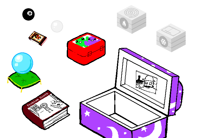 Among the FORTUNE TELLING KNICKKNACKS are these items: a CRYSTAL BALL plus compulsory VELVET PILLOW, a TAROT DECK, a MAGIC 8 BALL, a MAGIC CUE BALL, and one of your favorite books of all time, PROBLEM SOOTH.