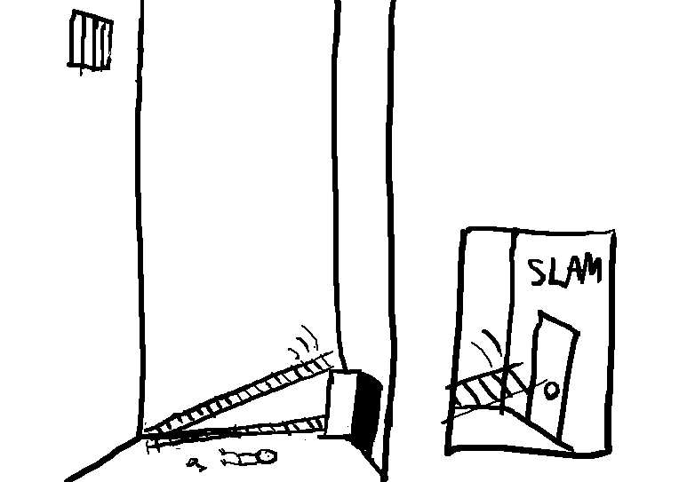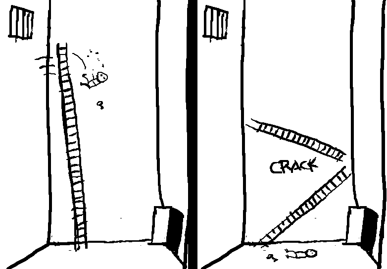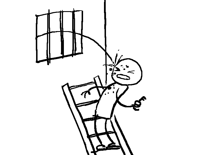 The urine splashes onto the man outside, who had a change of heart. He is climbing a ladder to give you the key.