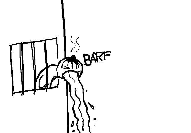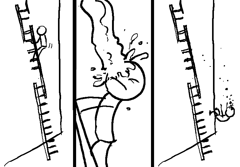 The man below has almost completely reconstructed the ladder using the same method he used to build the stilts. He is nearly up to your cell when he is met with a face full of regurgitated urine.