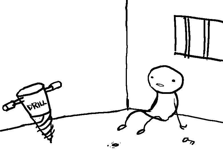 You wake up in your cell after a short nap. There is a key to your side, a drill against the wall, and a small pee-soaked hole in the floor.