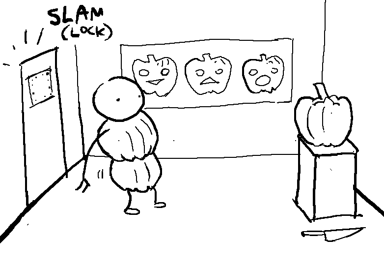 You step through the door, which instantly slams behind you and makes a locking noise. You have a feeling it is locked. In the room is a wall which has 3 pumpkin shaped recesses. One has a happy face, another sad, the other, scared or surprised or something. There is a fresh pumpkin on a pedistal, and a carving knife next to it.