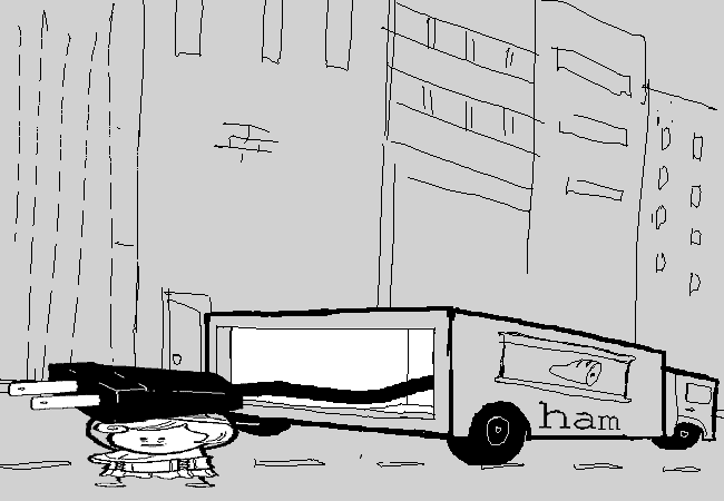 You exit the rear cabin of the HAM TRUCK, squashing your proportions even more. The look strikes you as unbecoming.