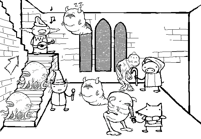 The four warriors valiantly melee their way through repulsive foes and onward to the top of the tower.