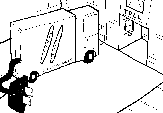 You back through the SQUARE SHOULDER TOLLS in reverse. It appears a driver for another local goods distributor is waiting for you.