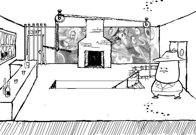MK enters his SPEAKEASY and re-lodges the OBOE between the doors.