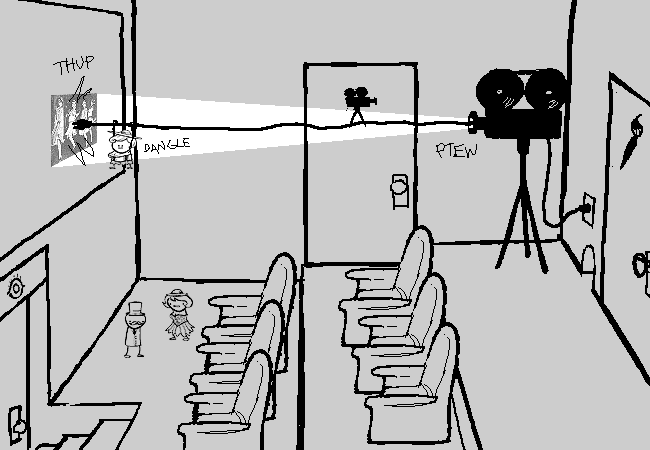 The plug is projected at high velocity into the MOVING PICTURE SCREEN, now at a reasonable scale.
