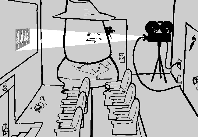 In your hurry to escape the awful red menace that is Fiesta Ace Dick, you don't notice a small man on the floor with an eyepiece. You squash him like a bug.