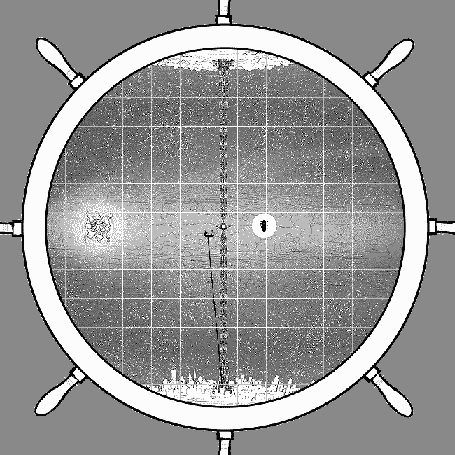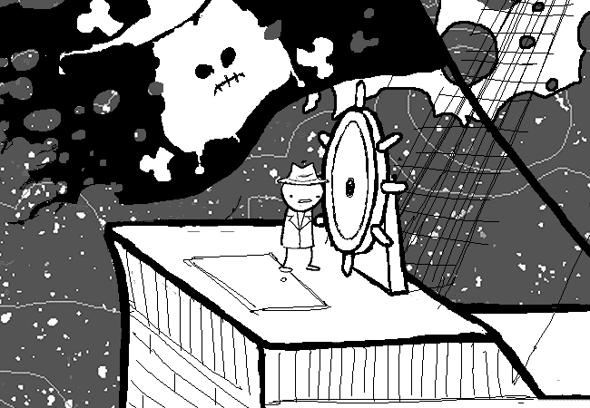 Problem Sleuth mans the wheel for no very good reason since it doesn't actually serve any purpose in steering the ship. Still, maintaining appearance of command over the vessel is good for morale.