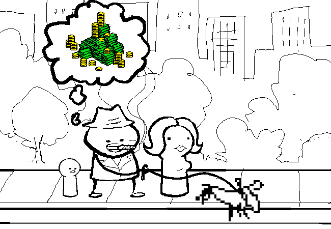 You stroll down the sidewalk with your beautiful, loving family, thinking fondly of all the riches and power you've accumulated. You're going to get a bite to eat at a restaurant you run, and then take in a motion picture at a theater which you also own. It's safe to say you hold this town in the palm of your hand.