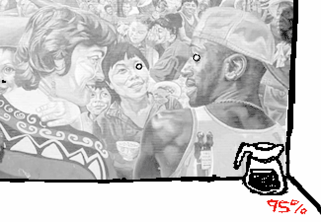 It looks like there are two holes in the mural. They are spaced far apart, just wide enough for someone with sensible human anatomy to look through with both eyes.