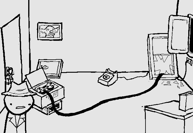 You suddenly hear noises coming from Ace Dick's office. You figure as long as your office is dark, you might as well check on him through the clown holes.