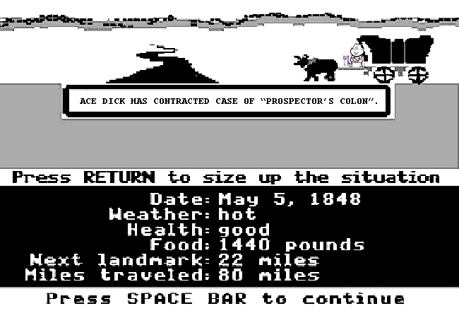 You purchase an OX, and some goods like CURED MEATS, WHISKEY, TOBACCO, and other essentials. You pack your supplies into your COVERED WAGON.