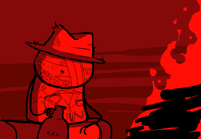 Your OXEN have died and you've long-since consumed their remains. You are out of supplies. You have burned your WAGON for warmth. You nurse the opening of your JUG OF WHISKEY for any few precious drops that may remain.