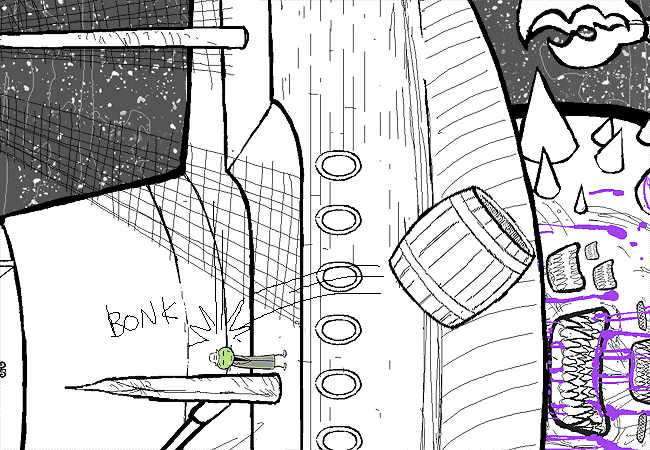 The BARREL bounces off PI's head, sailing overboard laterally.