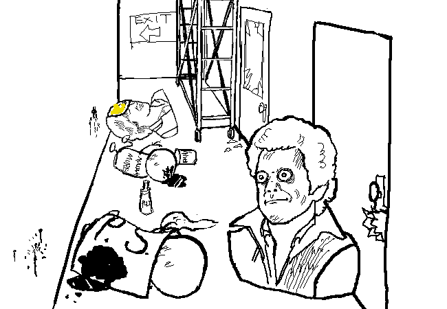 The bust crashed through the window, knocking out an employee of Madame Murel. He was wheeling a portable scaffold into place to prepare for some more mural work. He looks like he's in bad shape now.