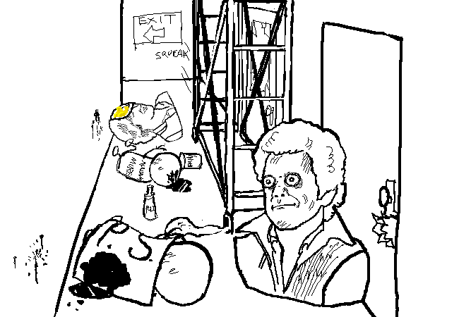 The scaffold continues rolling, coming to a stop in front of your door, jamming it shut.