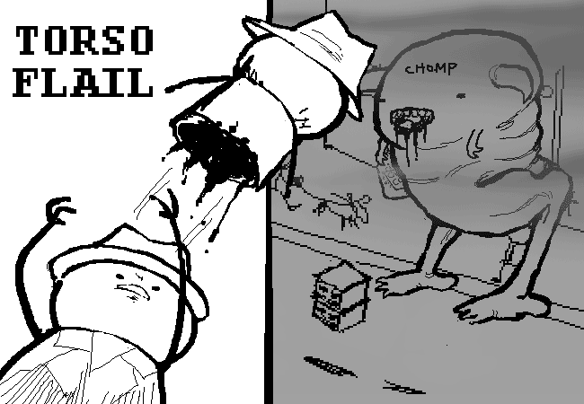 The beast gobbles the torso. He is temporarily placated by the red meat.