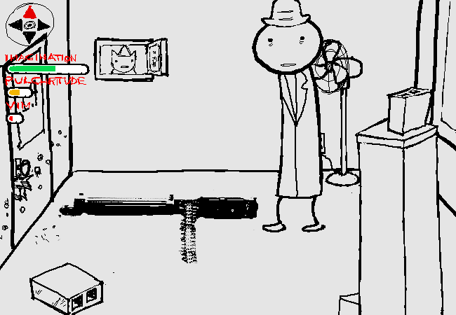 You drop the MACHINE GUN. Your VIM characteristic is way too low to carry around such a heavy object.