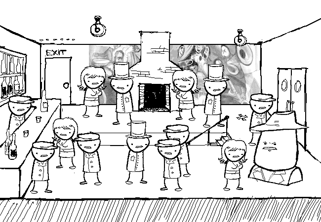 The room above is a busy speakeasy. The clients boisterously enjoy illicit libations.