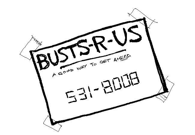 It is a business card for "Busts-R-Us". Probably a brothel, considering the lame double-entendre slogan, and the phone number, which if turned upside-down, spells "BOOBIES".