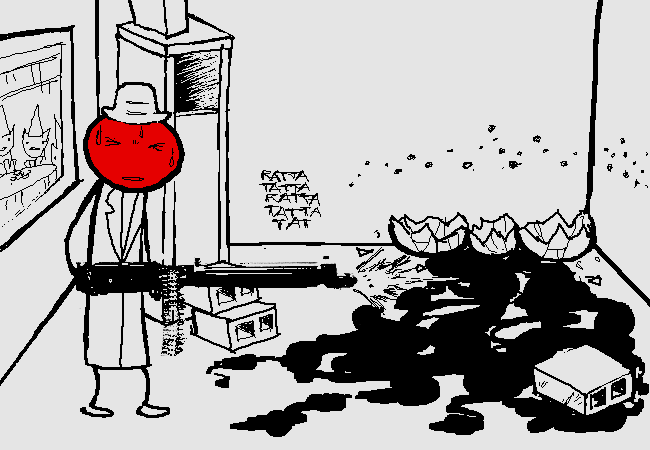 The MACHINE GUN suddenly goes off. The lousy thing has a HAIRPIN trigger.