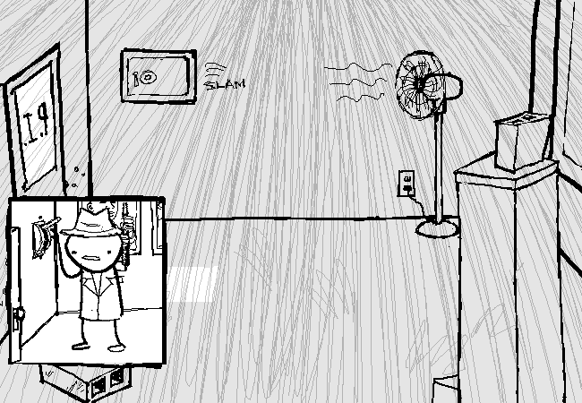 The fan turns on. The wind from the fan blows the safe shut.