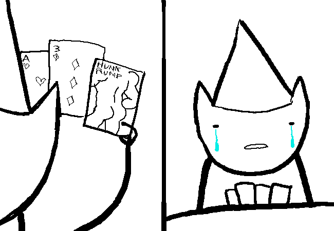 BLOD notices a pornographic playing card has slipped into the deck. He begins to cry.